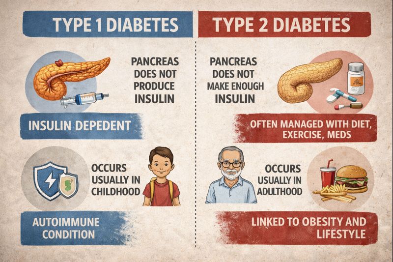 Type 2 Diabetes, the pancreas still produces insulin, but the body can’t use it effectively often due to obesity, poor diet, or inactivity.